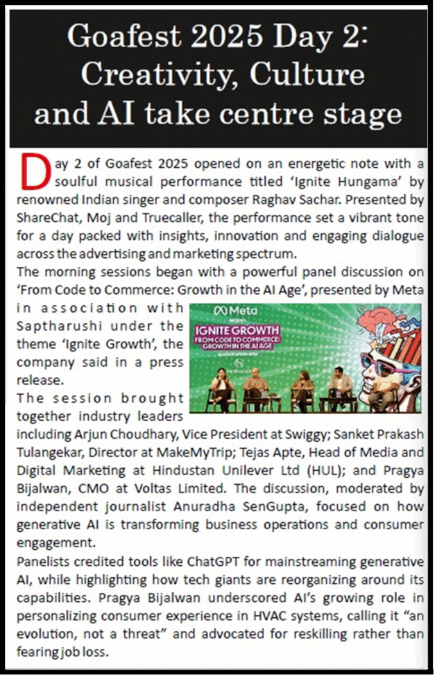Raghav Sachar. The performance ‘IGNITE HUNGAMA’ was presented by Sharechat, Moj and Truecaller, setting the tone for a day steeped in creativity, collaboration and cutting-edge insights. The morning of Day 2 started with a high-impact panel titled ‘From Code to Commerce: Growth in the AI Age’, featuring a stellar line-up of industry leaders. Arjun Choudhary, Vice President at Swiggy; Sanket Prakash Tulangekar, Director at MakeMyTrip; Tejas Apte, Head of Media and Digital Marketing at Hindustan Unilever Limited (HUL); and Pragya Bijalwan, Chief Marketing Officer at Voltas Limited came together for a lively discussion moderated by independent journalist and producer, Anuradha SenGupta. Presented by Meta in association with Saptharushi under the theme ‘IGNITE GROWTH,‘ the panel discussed how generative AI is reshaping business across sectors.